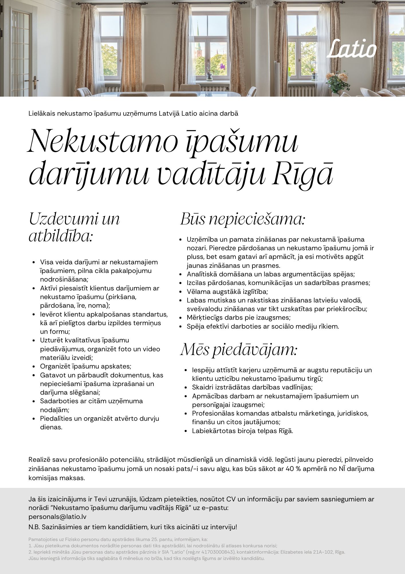 Sūtiet savu CV un pieteikuma vēstuli uz e-pastu personals@latio.lv vai pa pastu: Elizabetes iela 21A-102, Rīga, LV-1010.