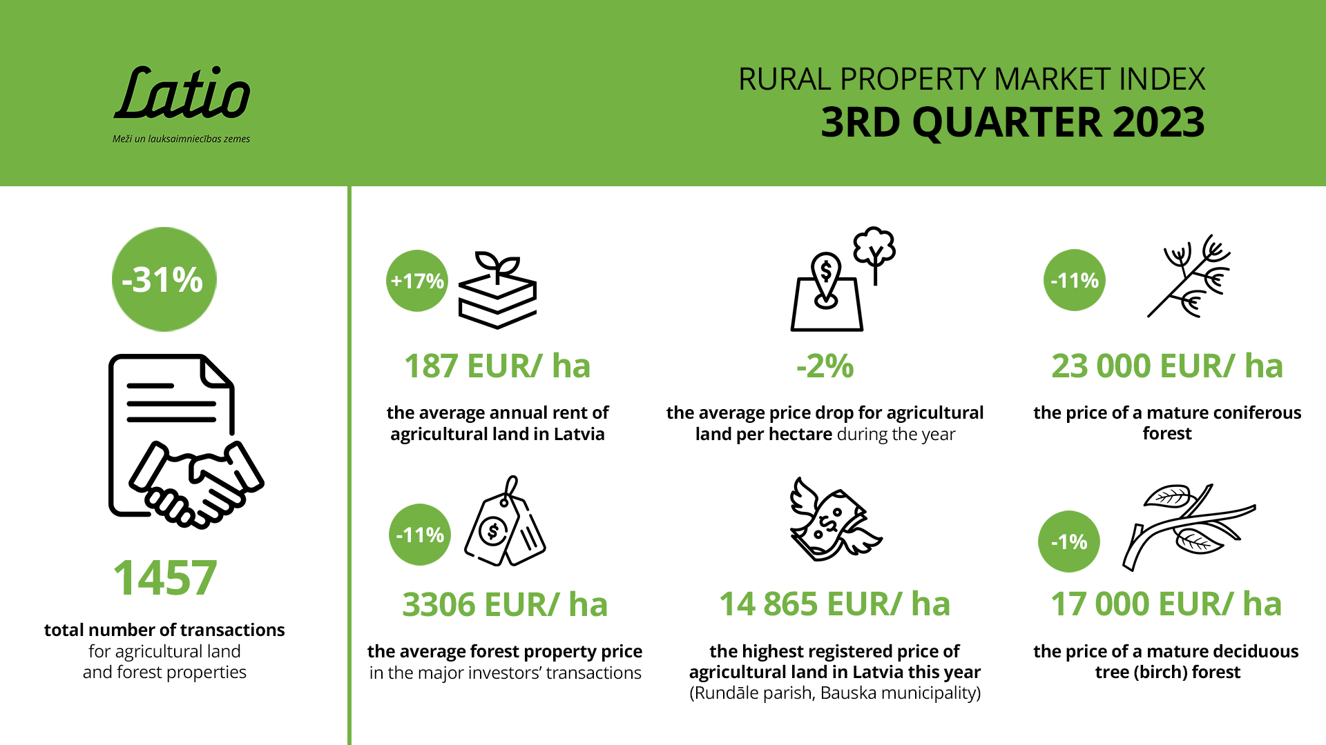 The battle for forests has resulted in an indefinite hiatus in transactions, with significant implications for the agricultural and forestry sectors. According to the latest "Rural Property Market Index" by "Latio," both agricultural land and forest land, which is the source of timber for the country’s primary export commodity, are facing a remarkable decline in market activity as compared to the start of the year. This slowdown is attributed to high interest rates, making it challenging for farmers to secure bank financing for land purchases. Consequently, there is a noticeable reduction in the demand for rural land. Another contributing factor to the shift in demand is the previous sale of the most valuable and fertile agricultural land plots in recent years. As a result, these sought-after plots will not be seeking for new owners that soon. This trend further impacts the dynamics of the rural land market. Simultaneously, events unfolding in Europe have cast a shadow over the forest properties segment, leading to a decrease in demand for timber produced in Latvia. At the beginning of the year, the average price for forest property stood at 4,292 EUR per ha. However, the latest data indicates a significant drop to 3,306 EUR per ha. Notably, the total number of transactions in this sector has declined by 31% compared to the third quarter of the previous year. These shifts underscore the complex interplay of factors influencing the dynamics of both agricultural and forest land markets.