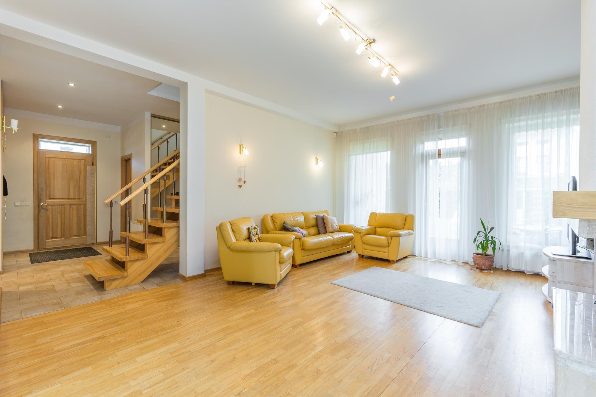 На первом этаже дома расположена гостиная студийного типа с камином, спальня и санитарно-технический узел, а на втором – холл, три спальни, благоустроенное гардеробное помещение. Под 1-ым этажом здания имеются частично поостренные просторные подвальные помещения, где находится технический узел дома.