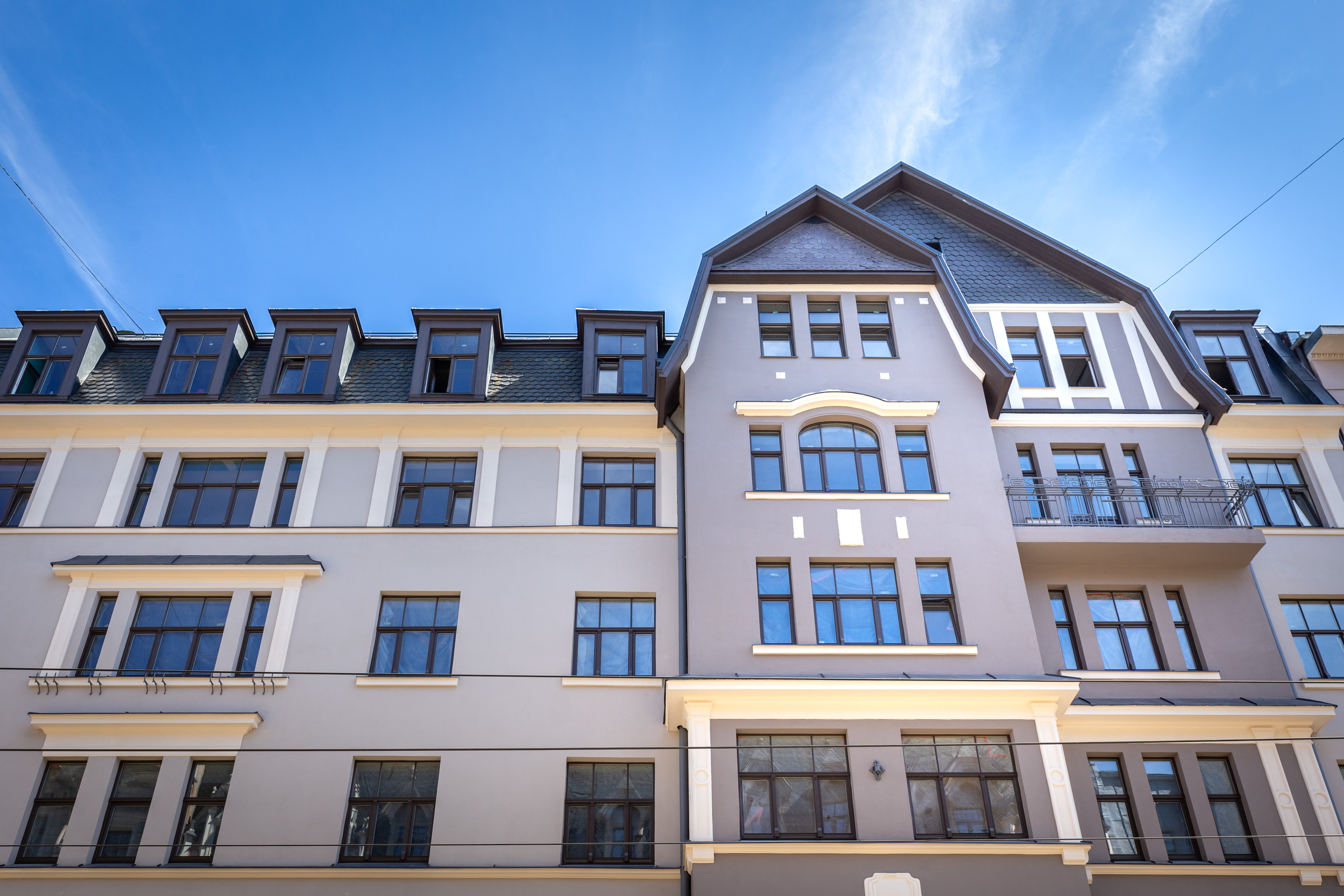 The building at 69 Kr.Valdemāra Street used to accommodate a residence hall and a library of the University of Latvia. Following the renovation of the building, which has resulted in the refurbishment of the facade of the house, staircase and utility systems, approximately 50 one- to four-room apartments ranging from 14 sq m to 91 sq m have been built in the house. The projections of the bay windows on the facade of the house and their specific, trapezoidal shape form an interesting, original layout of the apartments. The average ceiling height in the apartments is 2.9 m. The apartments are offered to the new residents in a grey-shell condition – the future owners will have the opportunity to choose the interior and finishing materials of the apartments so that they can decorate their dwellings as they desire. The average price of the apartments is 1,700 EUR/sq m. New apartment owners can also buy storage space in the basement (400 EUR/sq m).