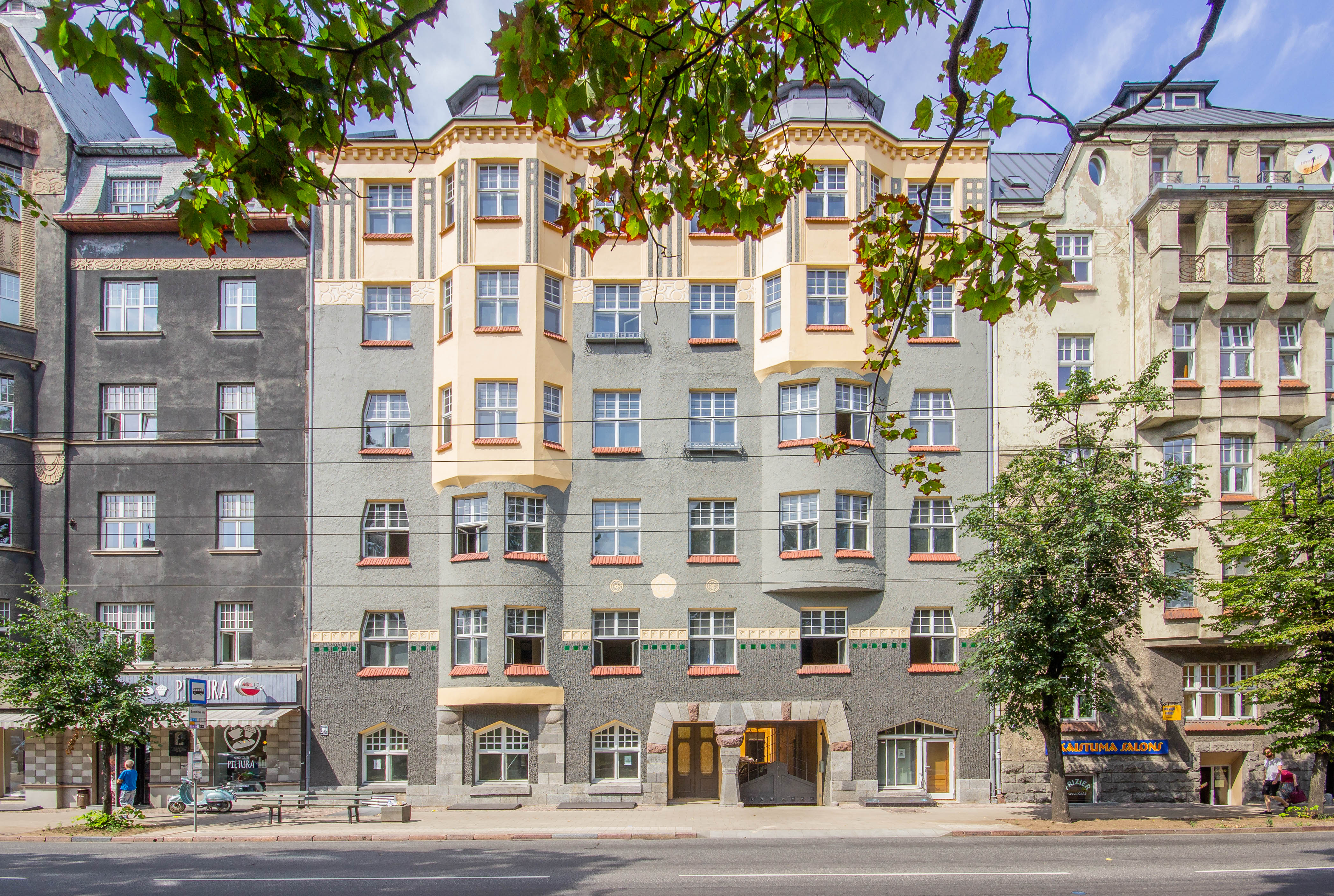 The house at 69 Kr.Valdemāra Street was built in 1909. Its architect, Aleksandrs Vanags, is one of the most prominent personalities in the Riga architects’ constellation that shaped the distinctive face of the city centre in the early 20th century. Both the house at 69 Kr.Valdemāra Street and the adjacent buildings are distinguished by monumental loftiness and steep roofs. Special attention is paid to the use of genuine, natural building materials in the exterior decoration of the buildings. The granite-carved support of the entry portal at 69 Kr.Valdemāra Street has the shape of poles frequently used in folk wood construction, complemented by impressive bay windows, beautiful textured plaster, intermingling with smooth plates, facade decorations in the form of folk motifs and mosaic tiles, as well as roof towers with weather vanes.