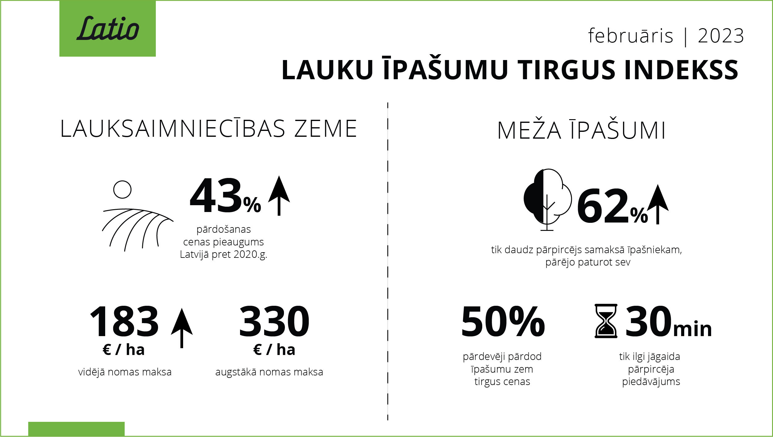 *Lauksaimniecībā izmantojamo zemju (LIZ) un meža īpašumu tirgus šobrīd ir viens no aktīvākajiem, taču potenciālajiem darījumu dalībniekiem šobrīd trūkst objektīvas, publiski pieejamas informācijas par norisēm šajā tirgus segmentā. Lai veicinātu pircēju un pārdevēju informētību, “Latio” katru mēnesi publicē “Lauku īpašumu tirgus indeksu”, atspoguļojot aktuālos tirgus situācijas datus.
