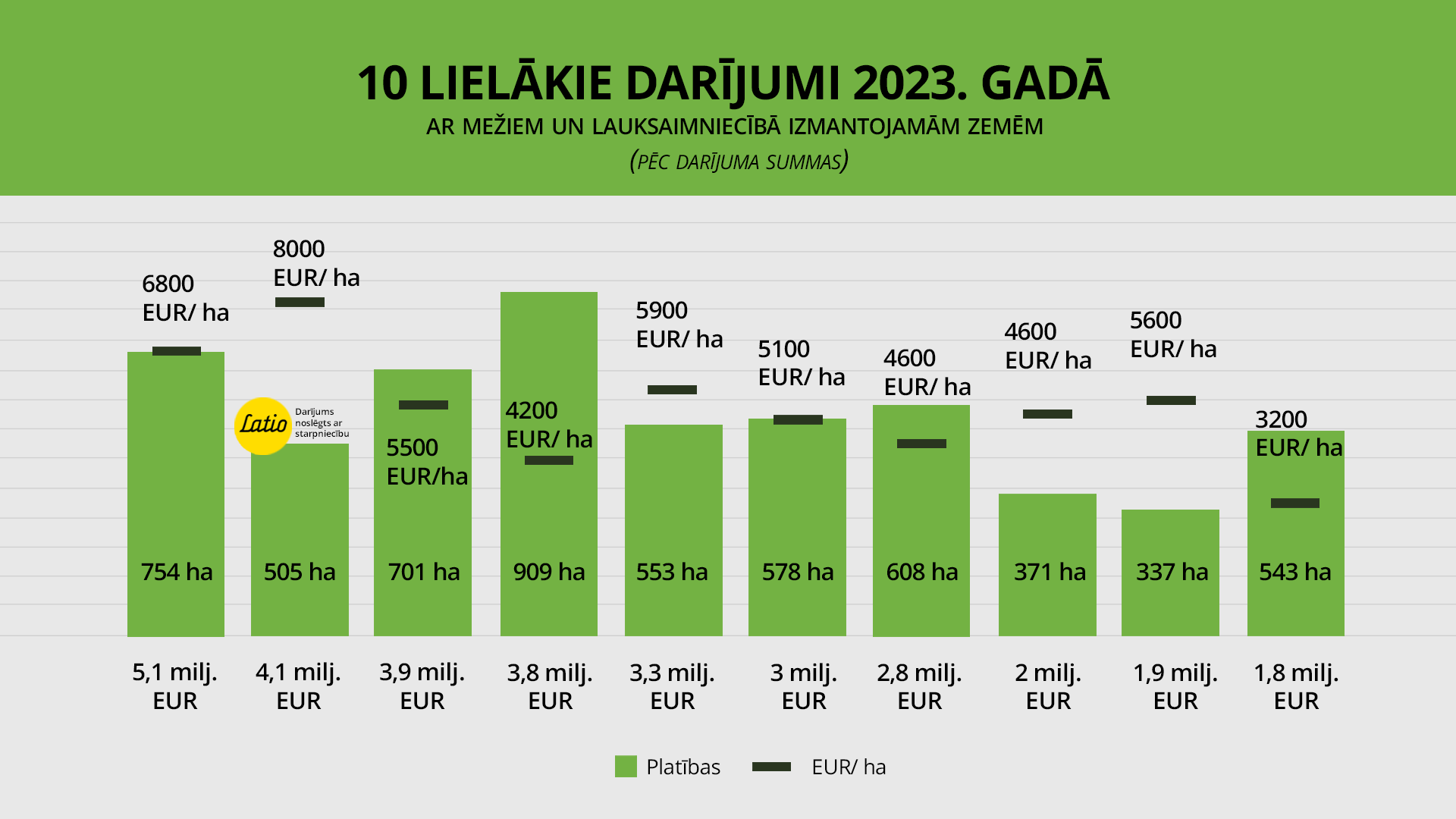 Summas ziņā apjomīgākais darījums, pārsniedzot 5 milj. EUR, pērn fiksēts Ogres novadā, uzņēmumam ar Vācijas kapitālu iegādājoties lauksaimniecībā izmantojamu zemi, kā arī krūmājus un mežu ar kopējo platību 754 ha. Otrs lielākais darījums ar “Latio” izsoļu starpniecību noslēgts pērnā gada pavasarī par kopējo darījuma summu 4,06 milj. EUR, pircējam iegādājoties 35 zemes vienības Kurzemē un Zemgalē ar kopējo platību 505 ha. Darījums izcēlās ar meža nozarei retāk raksturīgu gadījumu – īpašumus no uzņēmuma ar Somijas kapitālu iegādājās vietējais meža apsaimniekošanas un mežizstrādes uzņēmums. Savukārt lielākās platības viena darījuma ietvaros visā Latvija teritorijā no kāda cita Latvijas mežizstrādes uzņēmuma iegādājies starptautisks investīciju fonds par kopējo darījuma summu 3,8 miljoni EUR.