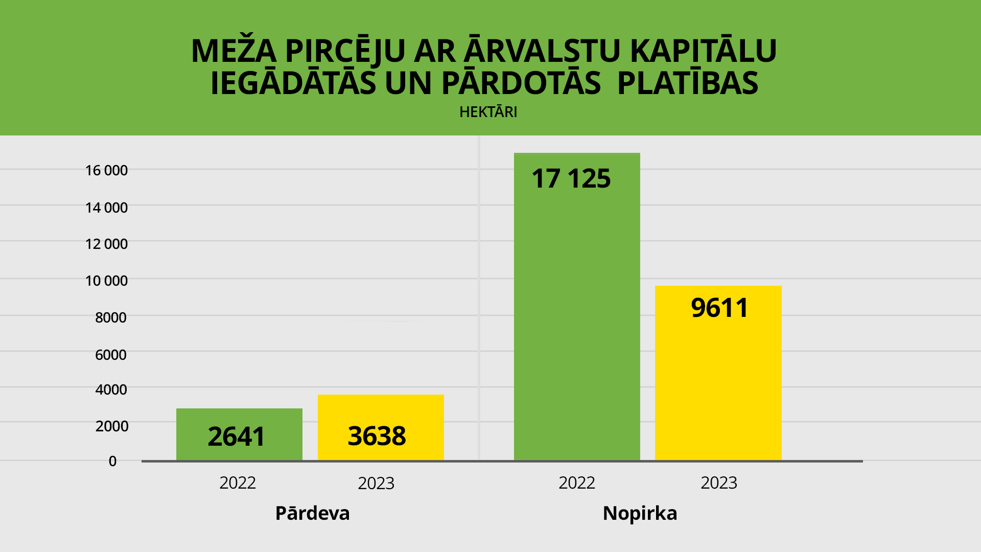 Pērn juridisko personu darījumos pārdoti 57 588 hektāri zemes, kas, salīdzinot ar 2022. gadu, ir kritums par 22%, liecina nekustamo īpašumu aģentūras “Latio” un portāla “Cenu banka” dati. Kopējā reģistrēto darījumu summa bijusi 254 miljoni EUR. Aktīvākie reģioni darījumos ar mežu platībām un lauksaimniecībā izmantojamām zemēm (LIZ) novēroti valsts austrumos – Latgalē un Vidzemē. Teju trešdaļa darījumu noslēgti Latgalē, savukārt 27% - Vidzemē. Pārējos reģionos, proti, Kurzemē, Zemgalē, kā arī Pierīgā vidēji notikuši 15% darījumu katrā no minētajām teritorijām.