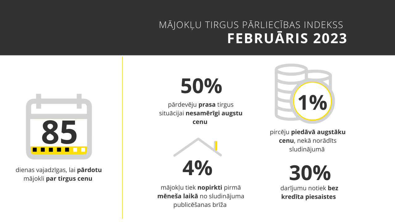 • 85 dienas – vidēji tik ilgs laiks bijis nepieciešams, lai pārdotu mājokli par tirgus cenu (janvārī - 80; decembrī – 70; novembrī – 61; oktobrī – 45; septembrī – 36);