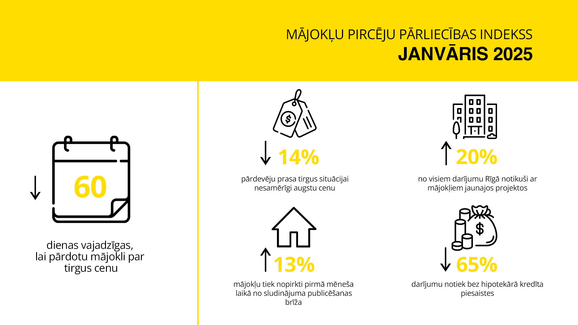 Kā novērojuši “Latio” darījumu vadītāji, janvāris mājokļu tirgū ienesis pozitīvas vēsmas, kas ir turpinājums tirgus aktivitātei pērnā gada otrajā pusē. Dienu skaits, kas nepieciešams mājokļa pārdošanai par tirgum atbilstošu cenu, samazinājies līdz diviem mēnešiem – šajā pašā laikā pērn pārdevējam bija jārēķinās ar vidēji 78 dienām. Tāpat samazinājies to pārdevēju īpatsvars, kuri piedāvā īpašumus iegādei par nesamērīgi augstu cenu – no 22% pērnā gada līdz 14% šā gada janvārī, liecinot par pielāgošanos reālai tirgus situācijai.