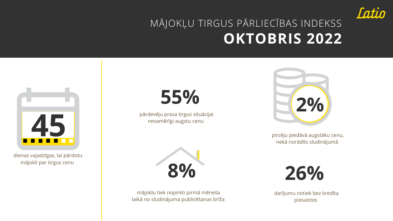 - 45 dienas – vidēji tik ilgs laiks bijis nepieciešams, lai pārdotu mājokli par tirgus cenu (septembrī – 36; augustā – 32; jūlijā – 28 dienas);