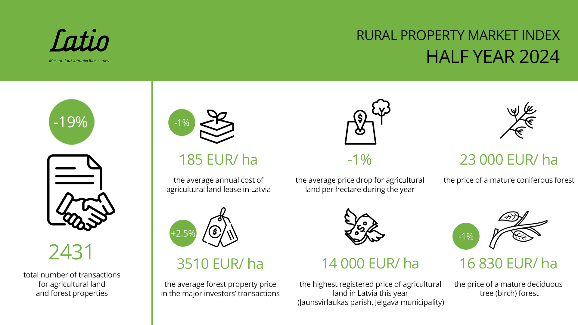 - 185 EUR/ ha – the average annual rent of agricultural land in Latvia (-1%);